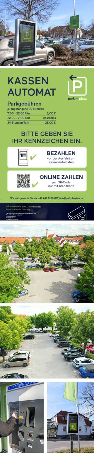 Beim Einfahren in unseren Parkplatz wird Ihr Kennzeichen gescannt. Wenn Sie die Parkfläche wieder verlassen, bezahlen Sie online per Handy. Über den QR-Code, der sich am Kassenautomat befindet, gelangen Sie auf die entsprechende Website. Oder Sie nutzen den Link auf unserer Website. Sie können diese Art von Bezahlfunktion innerhalb von 48 Stunden nutzen.